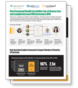 Effective care coordination for members requires timeliness, connectivity, and strong member engagement. Using Deviceless RPM combined with a team of Health Educators, Paramount drove a 187% increase in successful connection rates for virtual interventions, while simultaneously supporting 890 members with chronic, behavioral, and social determinants of health challenges.