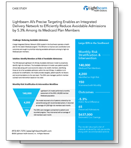 A large Integrated Delivery Network (IDN) in the Southwest reduced avoidable admission events by 5.3%, and the risk of avoidable admissions by 43% among its Medicaid members by using Lightbeam AI’s 30-day Avoidable Admission model.