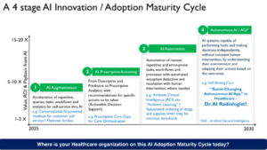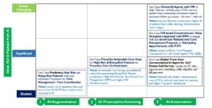 This is a useful tool to determine the level of AI enablement that is aligned with the use cases/job-to-be-done and the target user’s needs to ensure that the appropriate AI modality is deployed without “over kill” (“a jack hammer for every nail”). For instance, agentic AI/ AI agents to automate the underlying task, process or workflow may not be needed when a healthcare organization is looking for prescriptive actioning and recommendations for their care managers, or simply early identification / prediction of high-risk and rising-risk patients.